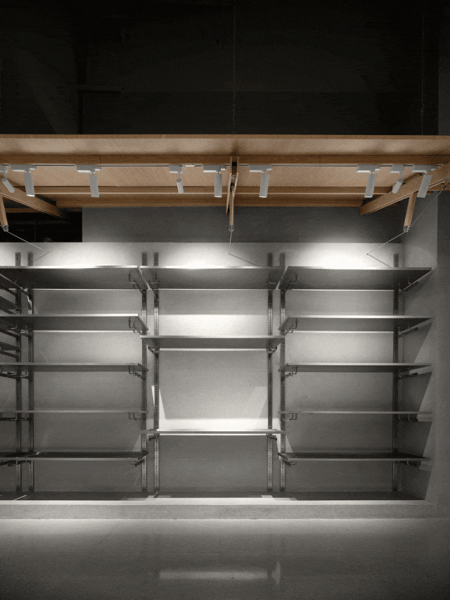 動線靠墻一側滿掛貨架。由于業主會對零售產品進行換季調整,貨架并未采用傳統固定式層板或掛桿,所有的層板及掛桿均可隨換季而輕松地調整高度及掛桿密度,保證了零售經營策略的靈活性。