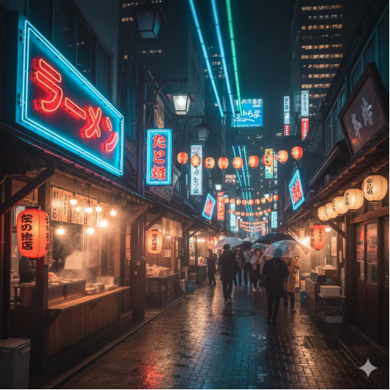 (提示詞:"夜晚的日本街頭市場,霓虹閃爍")