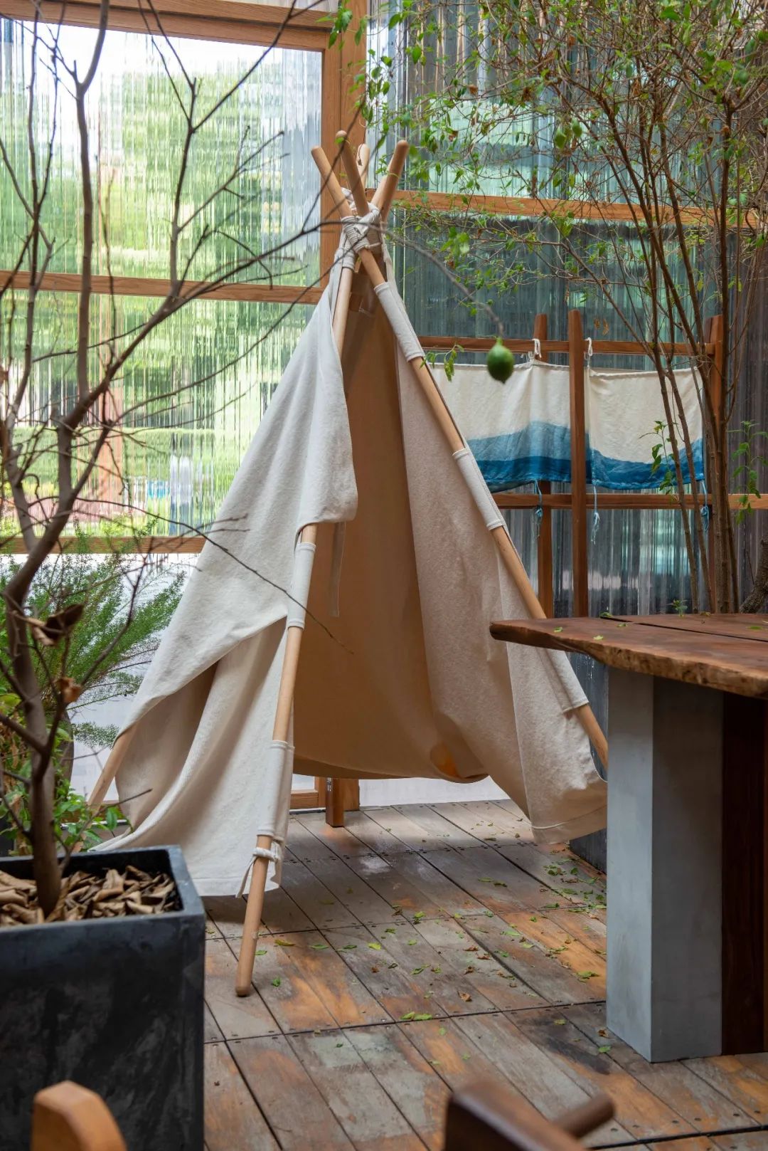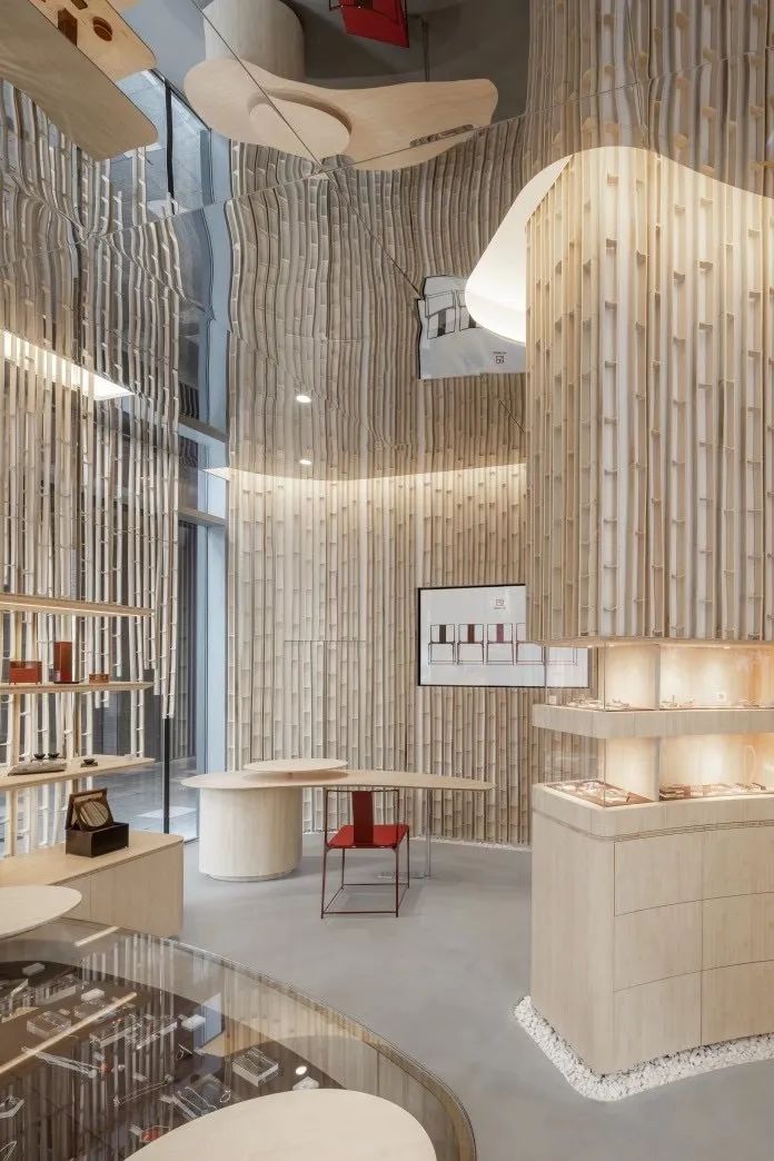 「上下」(SHANG XIA)是由設(shè)計師蔣瓊耳與法國愛馬仕集團(tuán)共同創(chuàng)立的當(dāng)代東方雅致生活品牌,成都遠(yuǎn)洋太古里店作為西南首家旗艦店,共有三層,集精品零售、家具空間、茶飲體驗于一體。一樓空間由日本著名建筑設(shè)計師隈研吾操刀設(shè)計,竹子被垂直切成薄片,內(nèi)部空間被蜿蜒的竹簾巧妙地鋪設(shè)成“城市竹林”。茶事空間由藝術(shù)家暨設(shè)計師蔣友柏設(shè)計,從室內(nèi)裝潢到茶飲設(shè)計都充滿科技感,又兼容并包了傳統(tǒng)元素與成都當(dāng)?shù)靥厣?/p>