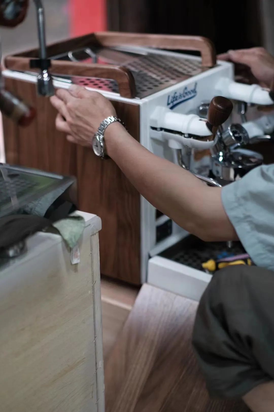 小小一個吧臺,配備了水龍頭,自動清潔盆碗的機器,咖啡機,小冰柜,自動壓粉的機器,三臺適配奶咖、美式、冷萃的磨豆機。幾乎就是一家專業的小咖啡店了。