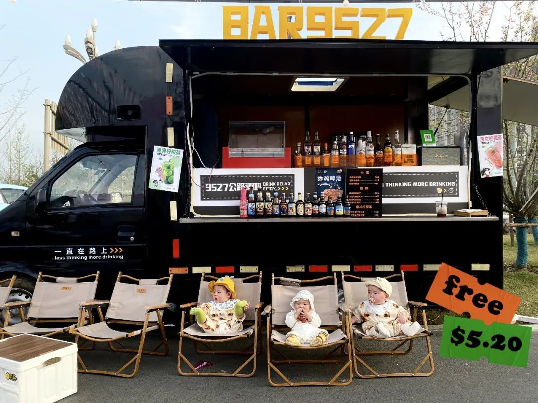 BAR 9527由一輛專項作業車改造而來,因為空間足夠大,甚至能站人,兔子一股腦往里頭裝了冰柜、制冰機、炸鍋、烤腸機和儲物柜,而且每次出攤都能帶1張大桌、4個折疊箱桌、8把戶外椅、10把小板凳,規模是成都數一數二的大。