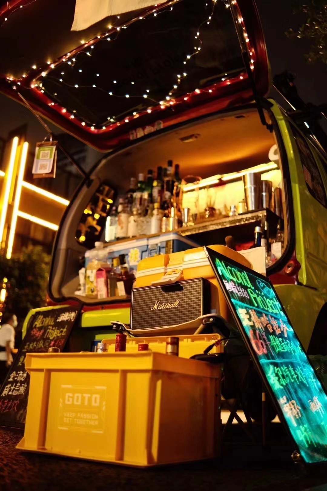 2.5米的高度,全黑,沿著車廂拉一圈金燦燦的燈帶,車頂的店招燈牌一亮,隔老遠你都能看見這輛酒吧車。