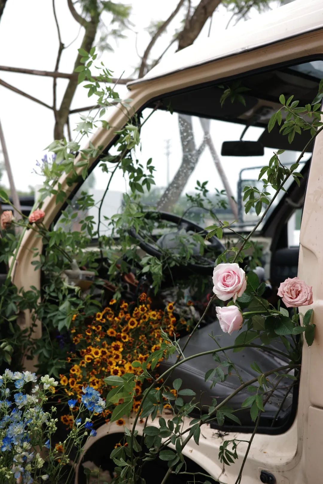 最近一次出車去島集,正好碰上車子在維修升級,真真和彭彭直接擺了個空殼子在現場,植物從車廂里蜿蜒爬出,仿佛千尋從神靈世界逃出來后,看到車子被森林霸占的場景。