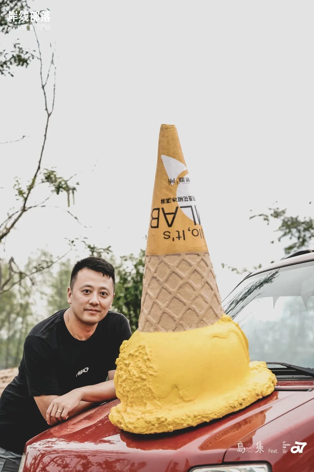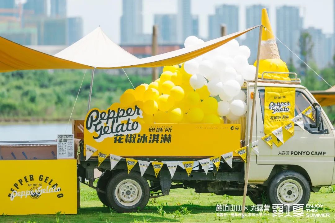 當時他借了丸露營的拖板車,用品牌標志性的黃色設計KT板,把車圍起來,還定制了一個倒扣的冰淇淋模型擺在車頂,邊上擺冰柜進行售賣。