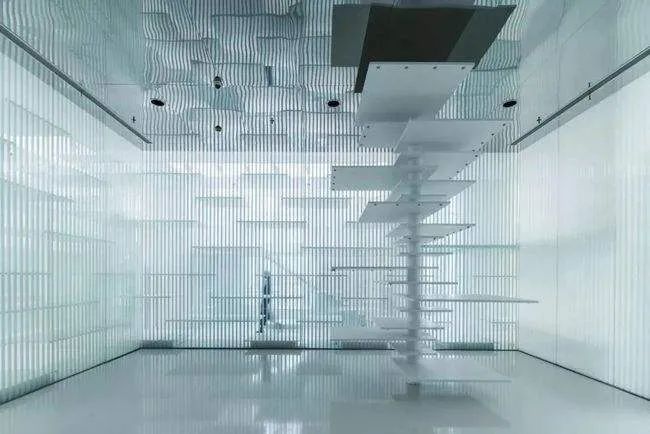 博物館共兩層,幾乎通體透白,由5653根鋼管垂直焊接支撐,以不同高度的層板交錯(cuò)出一種幾近不真實(shí)的未來(lái)感,建構(gòu)著Last Redoubt這個(gè)垂直城市。