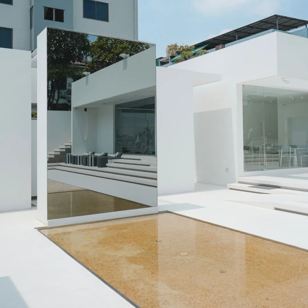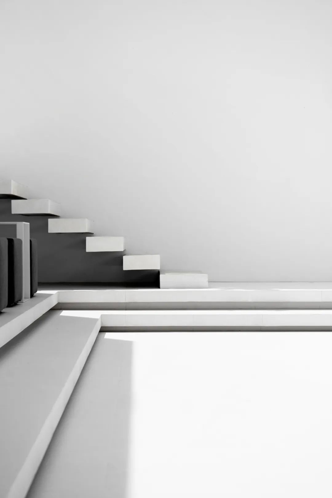 藏在空間盡頭的鏡面設計不僅巧妙地隱藏了建筑邊界,避免連續的白墻為空間帶來的單一性和迷失感,并拓寬了原有的空間尺度,增強了畫面的跳躍性。
