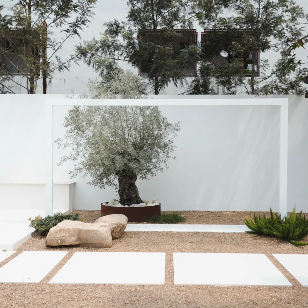 在樹種上優先選擇了線條感強烈的植物與簡潔的空間相呼應,實現整體設計風格的干練和統一,并謹慎地使用明暗不同的綠色,從嫩綠到墨綠,與黑白灰相呼應,使這些植物在點綴空間的同時又維持了整體設計的極簡風格。