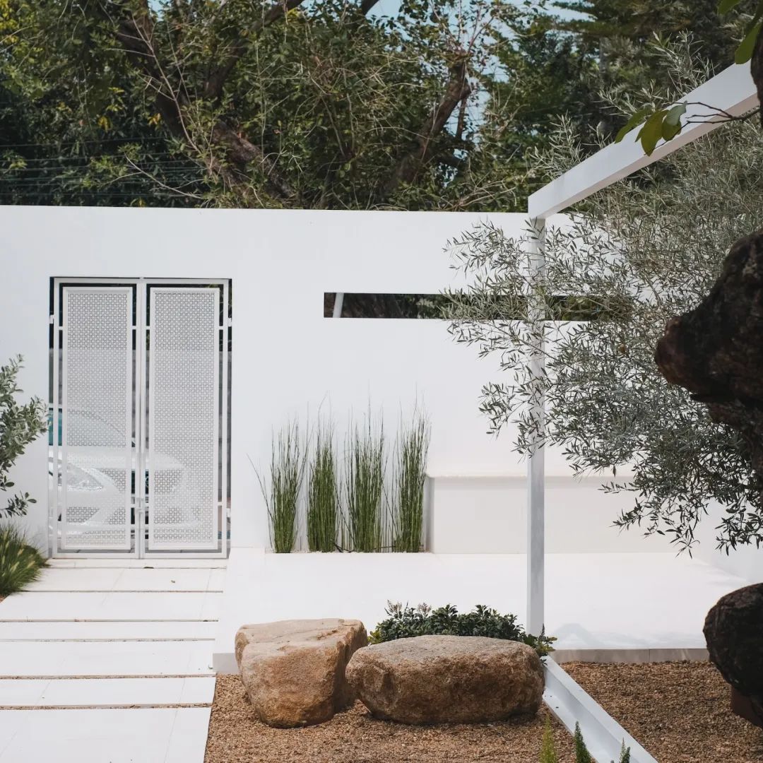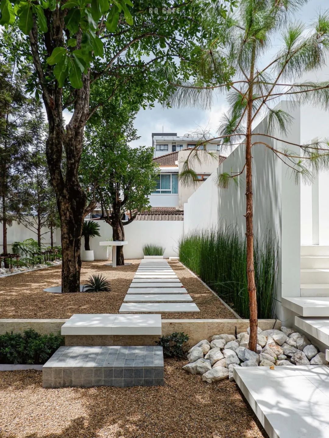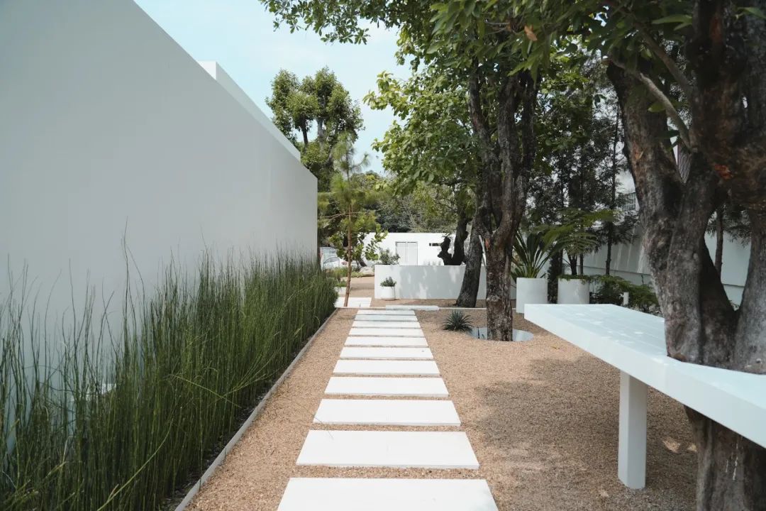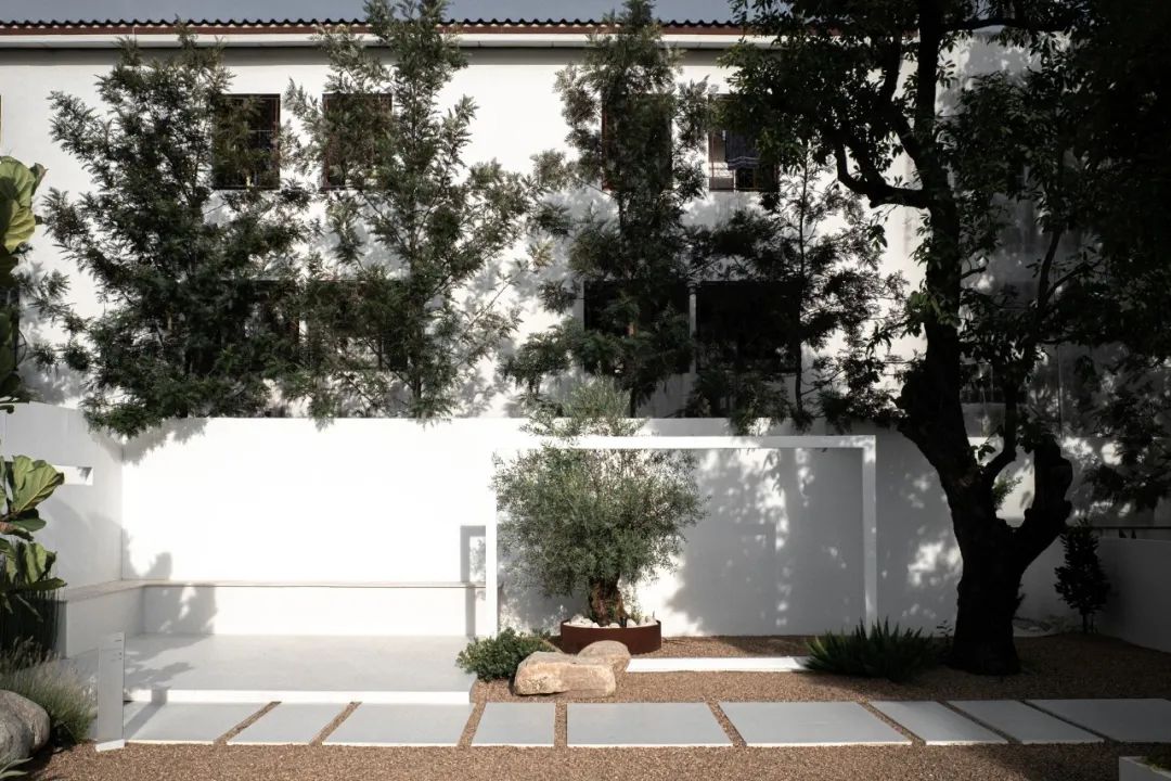 各色植物的加入,有效填補了這座純白的空間的“空白”,使其看上去不至于太單調。并柔化了這座帶有棱角的建筑,又巧妙利用喬灌植物的高差,打造空間層次感。
