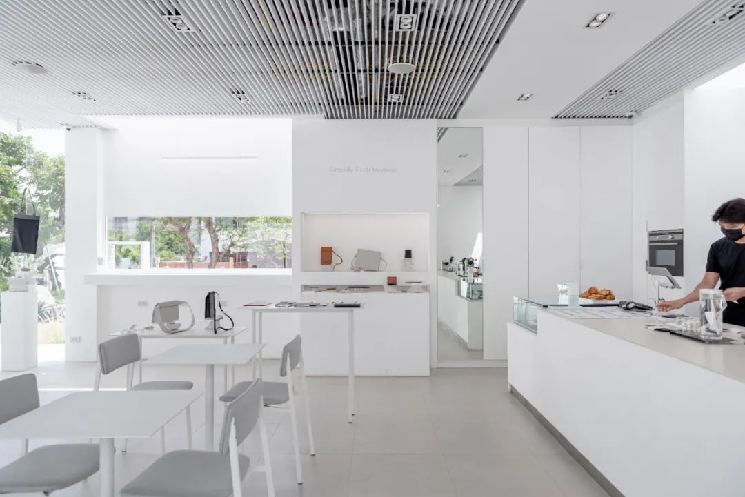 咖啡館本身都是簡單的白色。店內溫馨、安靜,店外則是適合拍照打卡的冷淡風格。入口的長廊道巧妙利用墻體和光線,將純白的色彩做出層次區分。