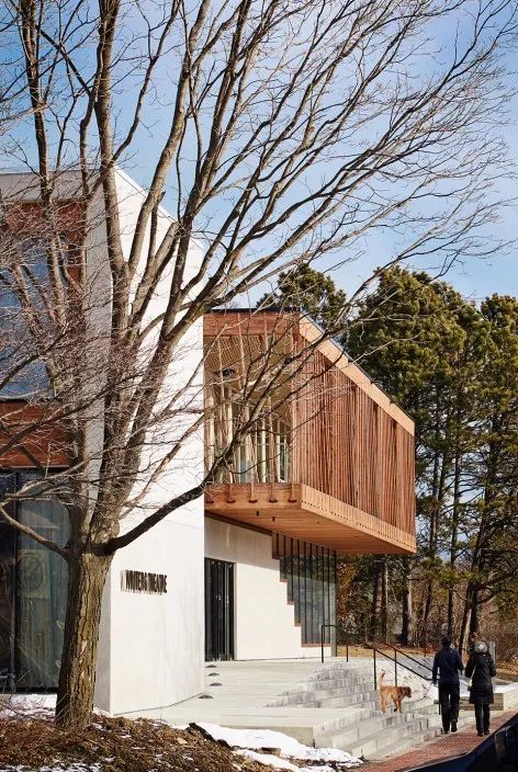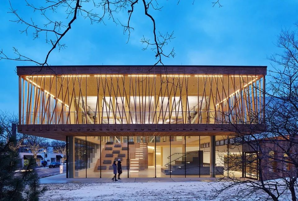 建筑師珍妮·甘及其芝加哥事務(wù)所展示了其通過平常的材料來展示項(xiàng)目非凡性的能力。在這個(gè)建筑中,雪松、玻璃和混凝土等包覆材料使得建筑實(shí)現(xiàn)了極具現(xiàn)代性的簡(jiǎn)潔外形。值得一提的是,運(yùn)用較多的雪松材質(zhì)呈現(xiàn)木色,在天氣很好的時(shí)候,與周圍景色遙相呼應(yīng),將建筑的自然特質(zhì)表露無遺。在夜晚,建筑化身為矩形燈籠,仿佛是一座巨大的指路明燈。