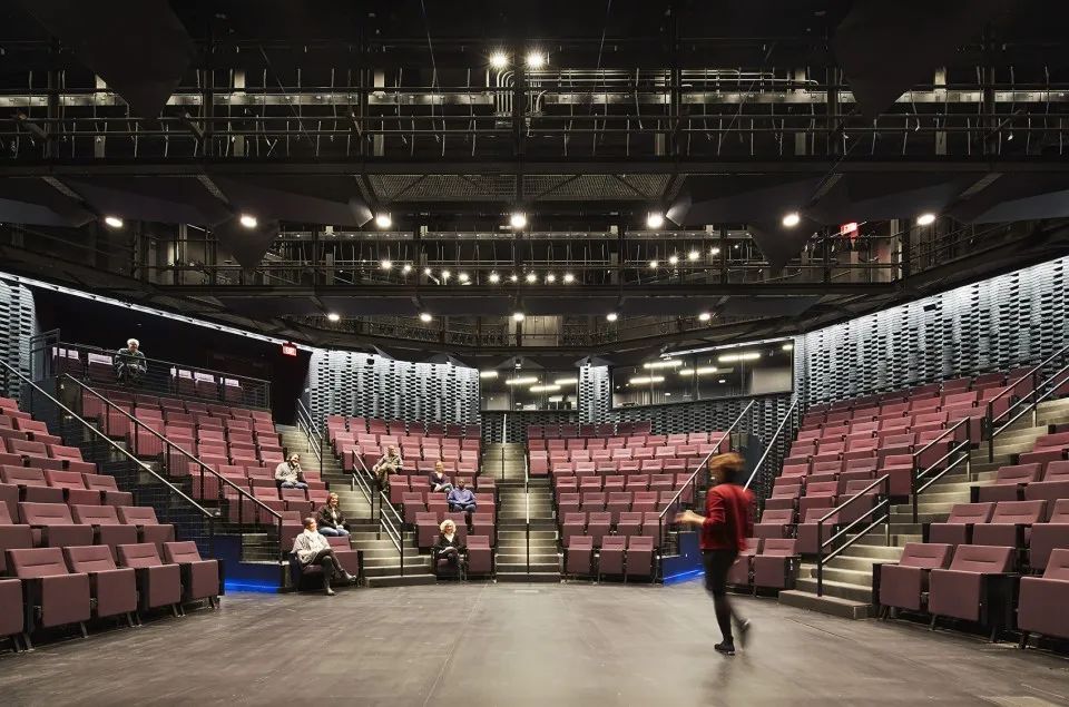 一樓設(shè)置的中庭既是公共聚集大廳,也能充當(dāng)演員彩排、小型劇場(chǎng)、非正式演出和觀眾外延服務(wù)的場(chǎng)所。大廳由大面積透明玻璃圍合,能夠吸引臨街而行的社區(qū)居民進(jìn)入。如同劇場(chǎng)的藝術(shù)總監(jiān)邁克爾·哈勃斯特姆所說,希望它成為一個(gè)城市廣場(chǎng),一個(gè)人們可以在表演前、表演后或者表演間歇的時(shí)候交流集會(huì)的場(chǎng)所,這與之前身處書店的狹窄空間相比不可同日而語。