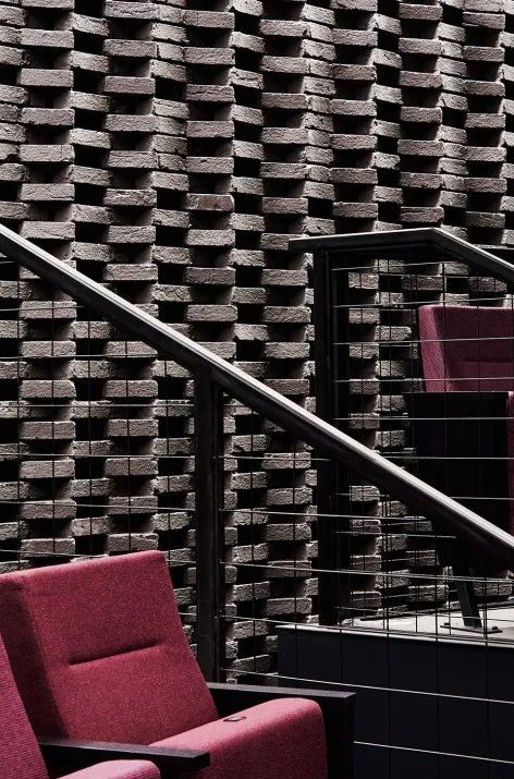 中庭連接了擁有250個(gè)座席的劇場(chǎng)以及能夠讓99個(gè)觀眾隨意坐下的黑盒子演出廳。劇場(chǎng)的設(shè)計(jì)致力于表演者和觀眾之間親密度的最大化,看臺(tái)式的坐席與墻體脫離,在劇院樓層和演出區(qū)域之間形成了流暢的過渡。磚塊是從女子圖書俱樂部(劇院的原有建筑)中回收利用的,以向歷史致敬,這些材料形成了一個(gè)有圖案的、能夠擴(kuò)散和反射聲音的后墻隔聲屏。較小的黑盒子演出廳可靈活改造,用于舉辦各種各樣的演出。