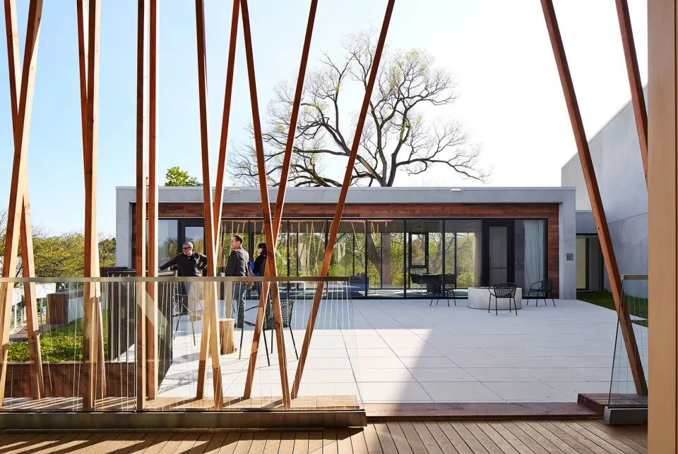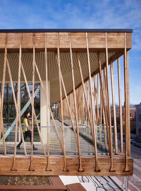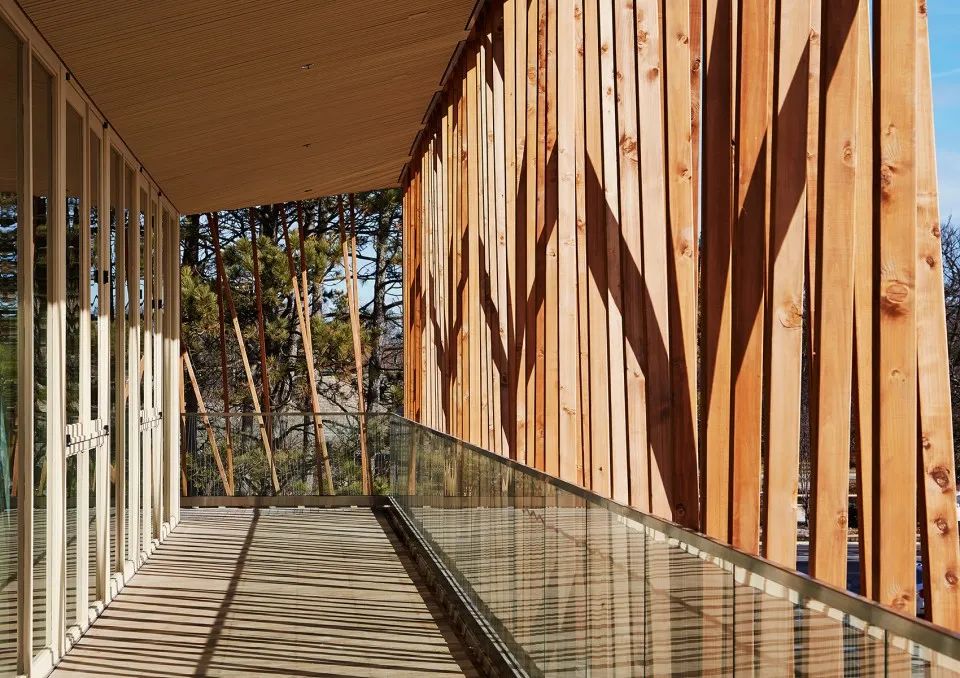 二層走廊的結(jié)構(gòu)為木質(zhì)空腹桁架以及一個(gè)較輕盈的木質(zhì)格柵,格柵懸掛在主體結(jié)構(gòu)下方承受拉力。通過這個(gè)架高的走廊、屋頂?shù)幕顒?dòng)平臺(tái)和休息室,人們可欣賞到格蘭科的鬧市區(qū)、附近的湖泊以及小樹林。
