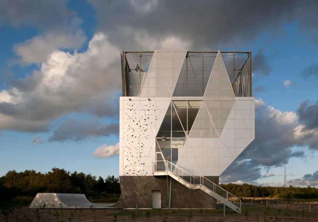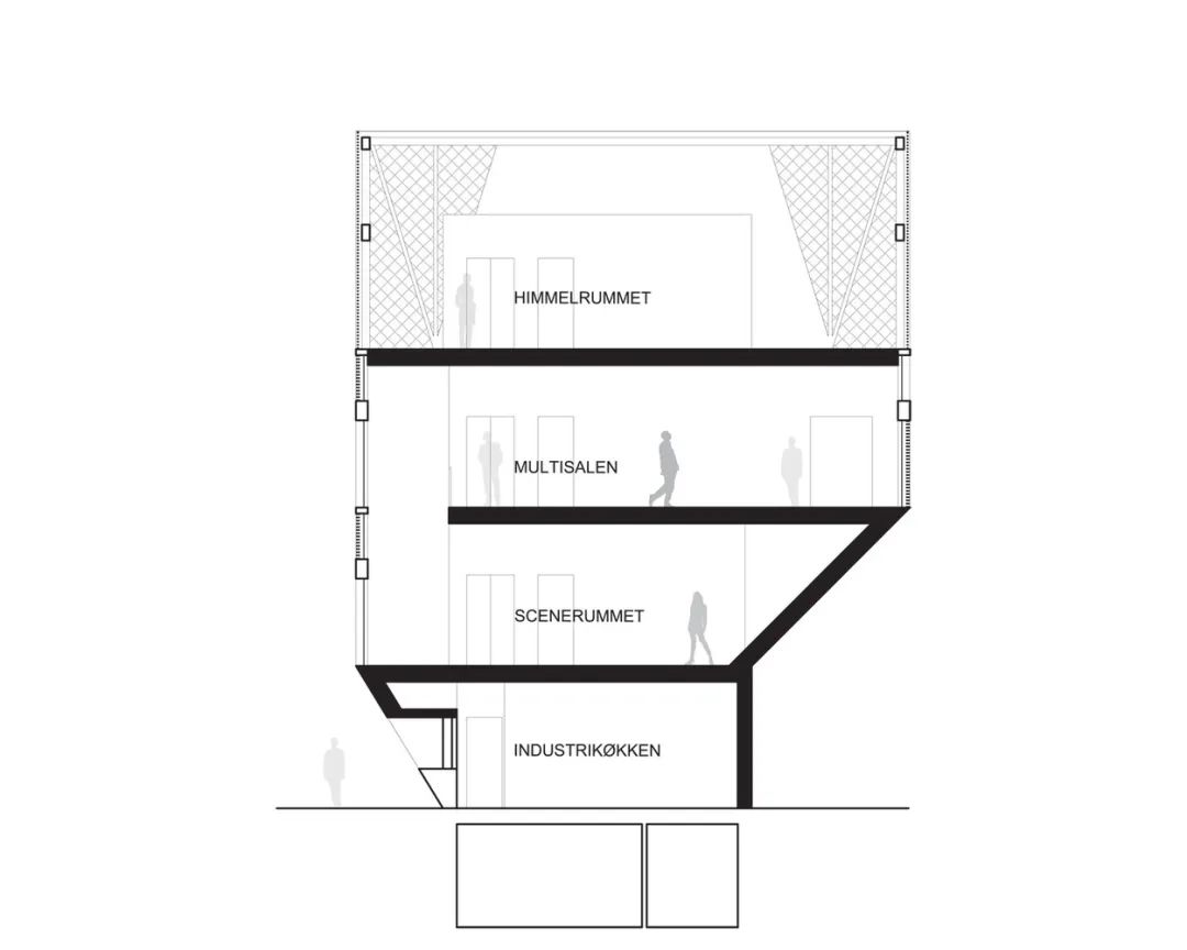 一樓的表演空間通過為觀眾增加樓梯來擴(kuò)展建筑物的布局。墻壁傾斜延伸至二樓,突出了約50平方米的舞臺(tái)地板。而傾斜墻壁的另一邊,設(shè)計(jì)師利用這個(gè)坡度增加了攀巖空間,達(dá)到了空間利用的最大效率。一層的空間可以靈活使用,可以通過關(guān)閉墻壁中朝向入口的滑動(dòng)門來關(guān)閉房間,當(dāng)關(guān)閉時(shí),舞臺(tái)地板也可用于較小的活動(dòng)。房間開放時(shí),表演空間通過開放式樓梯連接到二樓的多功能區(qū)。
