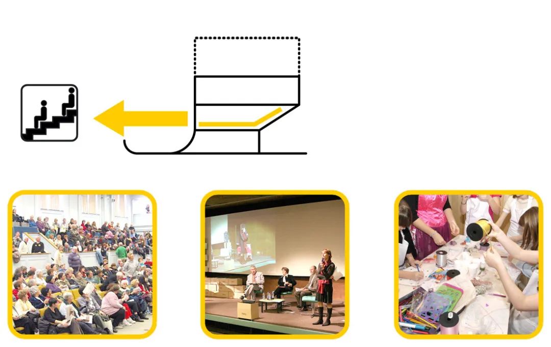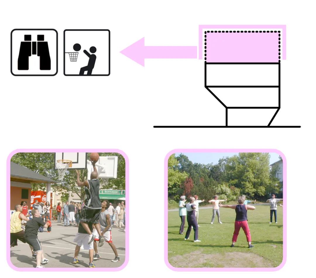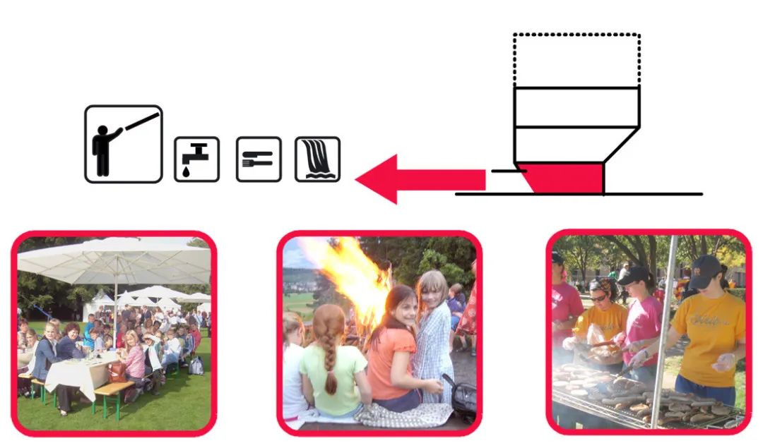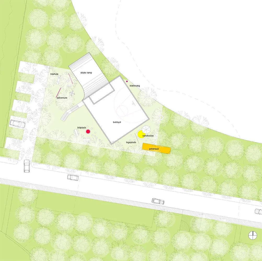 社區(qū)中心周圍環(huán)繞著常見的戶外活動(dòng)。客人可以直接進(jìn)入廁所,以便進(jìn)行所有戶外活動(dòng)。一層滑板坡道一側(cè)連接著攀爬墻壁,另一側(cè)是垂直山墻,通過墻壁上的艙口,室內(nèi)廚房與室外燒烤區(qū)和餐飲設(shè)施相連。在夏季,廚房是戶外活動(dòng)的中心,從夏季節(jié)日到周五酒吧或自發(fā)聚會(huì)。在冬季,除了建筑物中的活動(dòng)外,廚房還可以用作私人活動(dòng)的衛(wèi)星廚房。