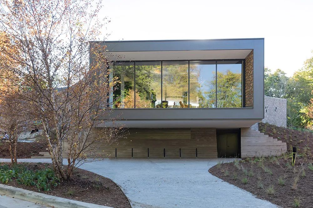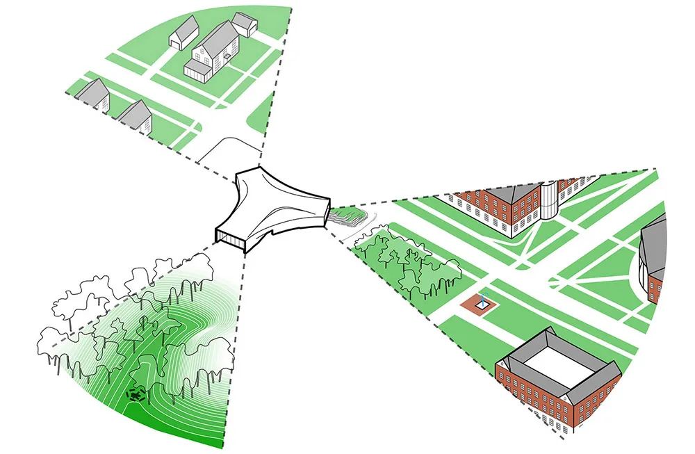建筑設(shè)計(jì)同樣敏銳地反映了其周圍獨(dú)特的現(xiàn)實(shí)環(huán)境文脈:一個(gè)居民區(qū),大學(xué)校園,以及一個(gè)天然 的樹林。它的三軸設(shè)計(jì)平面表達(dá)并且聯(lián)合了三種語境,內(nèi)凹的戶型墻面不但連接起巨大的透明立面,并且容納了內(nèi)部空間。