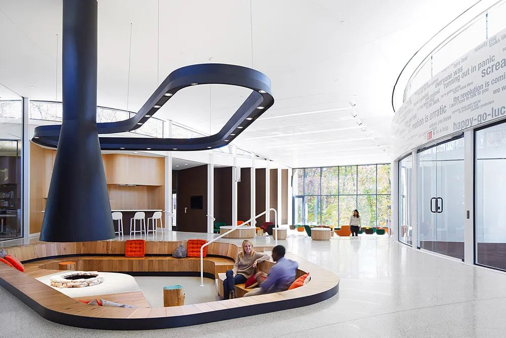 室內(nèi)的集會(huì)空間圍繞一個(gè)下沉式的壁爐空間展開,懸掛的壁爐下面是廚房空間,設(shè)計(jì)師希望更多集會(huì)能夠在炙烤爐火和分享食物的溫馨氛圍中順利舉行。