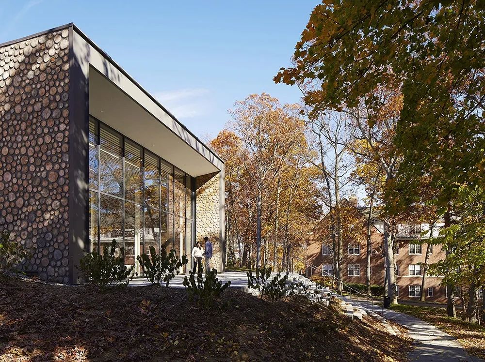在室外,三軸向的平面同時(shí)帶來三塊較大的綠地空間,東南側(cè)的空地打造成階梯狀的小型廣場(chǎng)。這一側(cè)的立面入口被設(shè)計(jì)師刻意弱化,如同立面上撕開的小口。這樣使得由樹木斷面拼成的立面如同帶有質(zhì)感的背景墻,吸引人們自覺地想要來到這里坐一坐,發(fā)生一些偶然的交流。