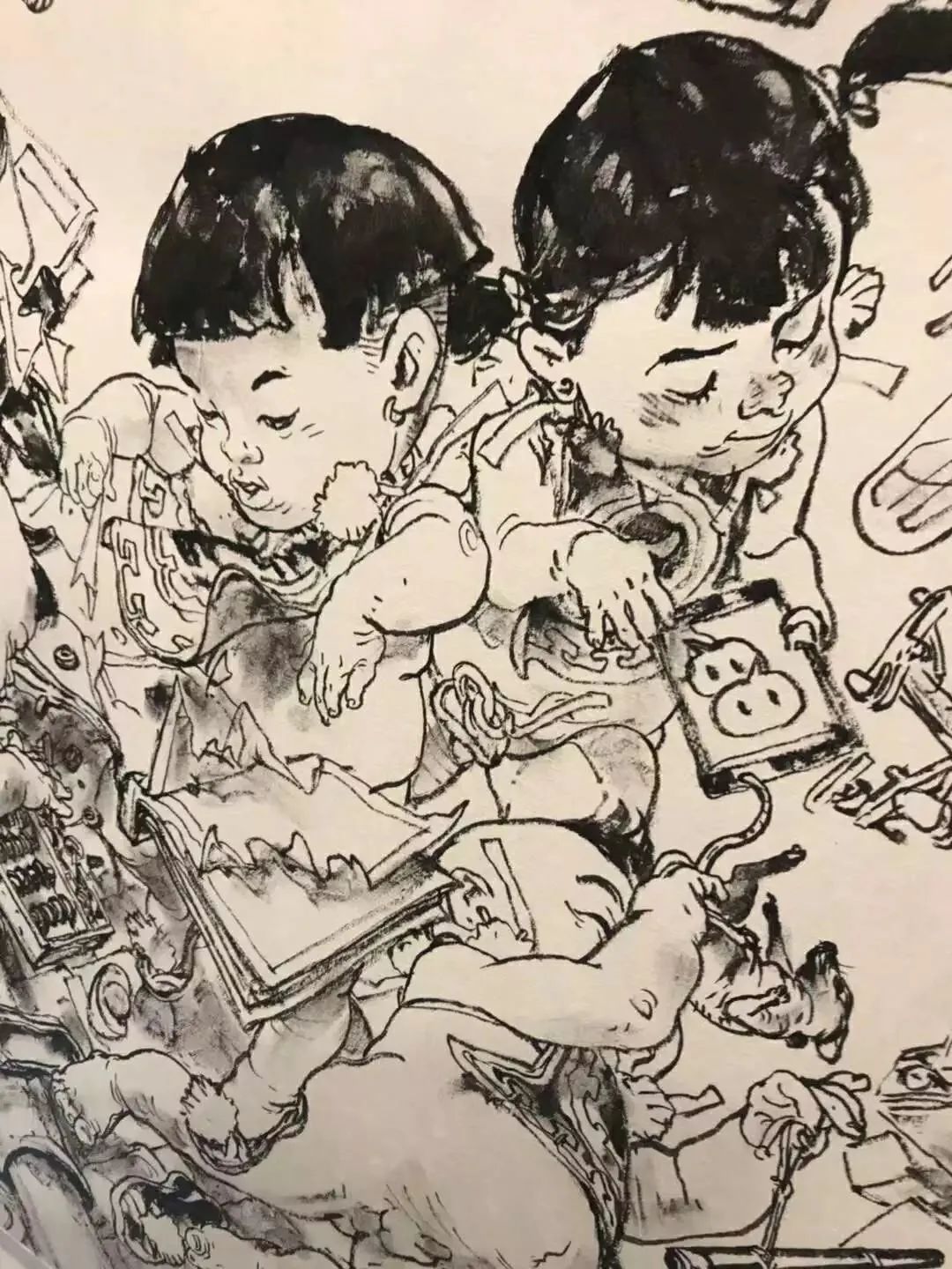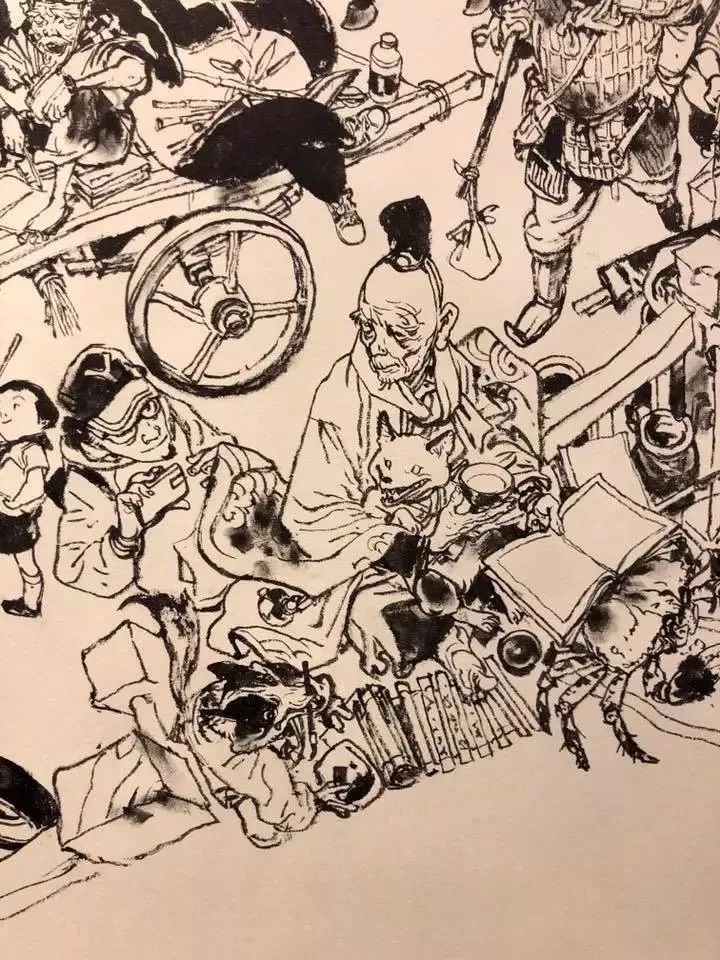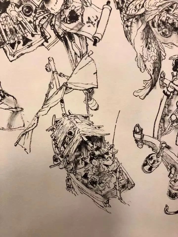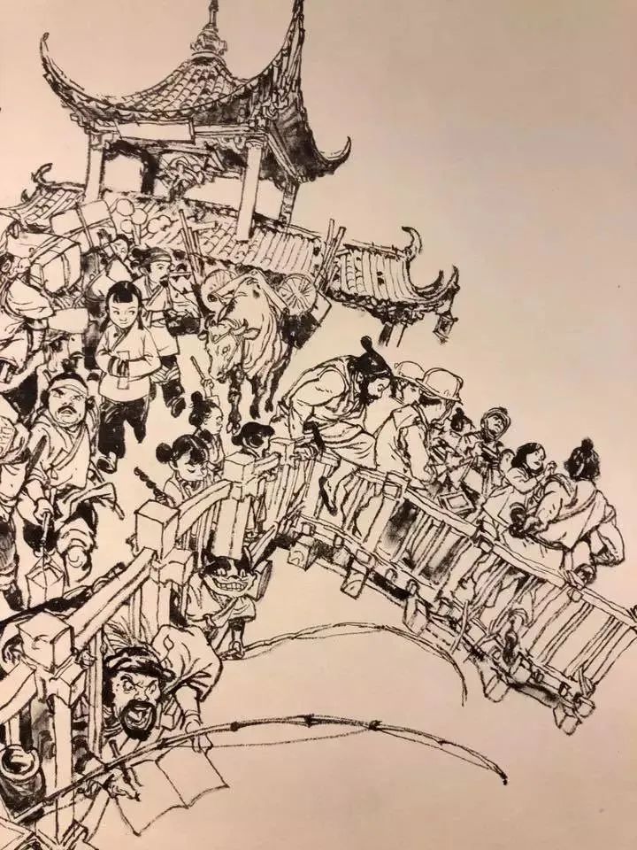 這一切都需要極高的審美和強大的基本功,人物位置、構(gòu)圖布局,他都能做到心中有數(shù),每個人物、物件的細(xì)節(jié)刻畫,則早已經(jīng)是刻在骨髓里的記憶,下筆猶如神助,行云流水。