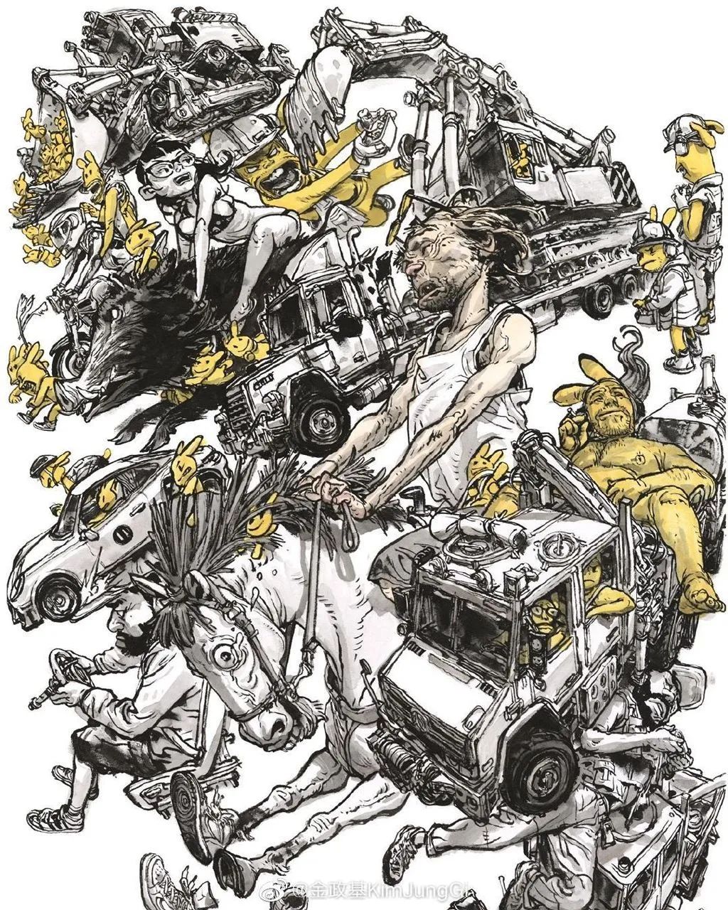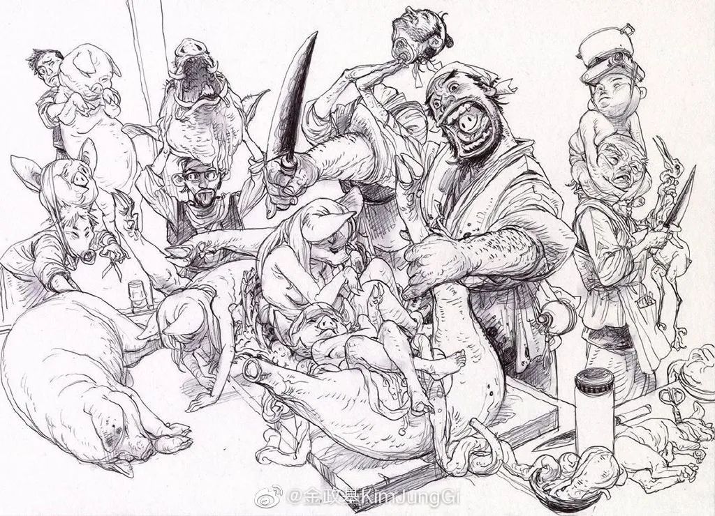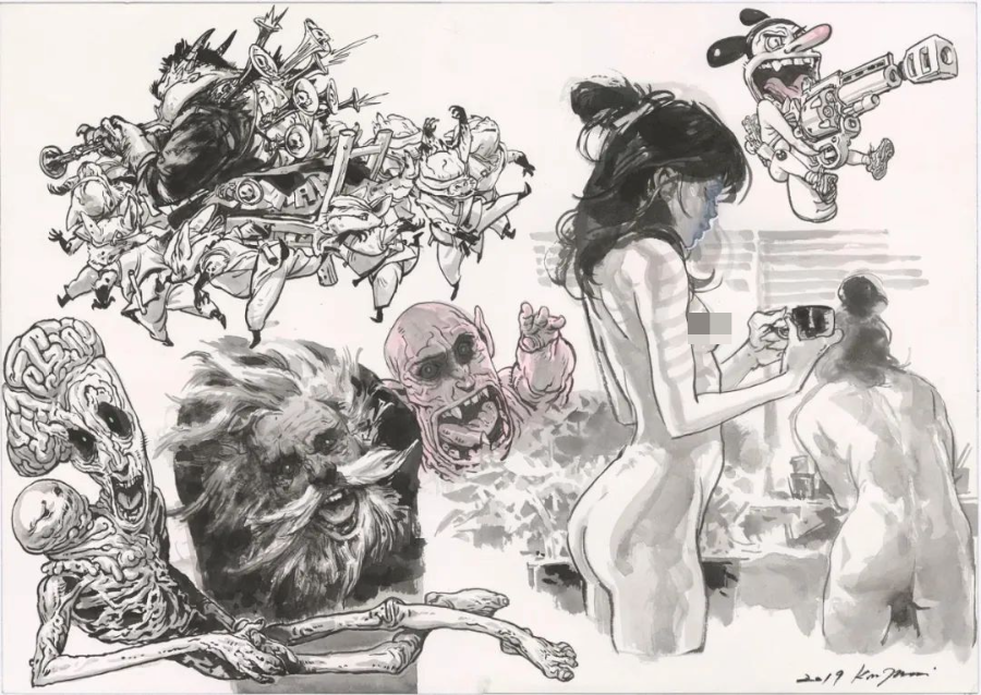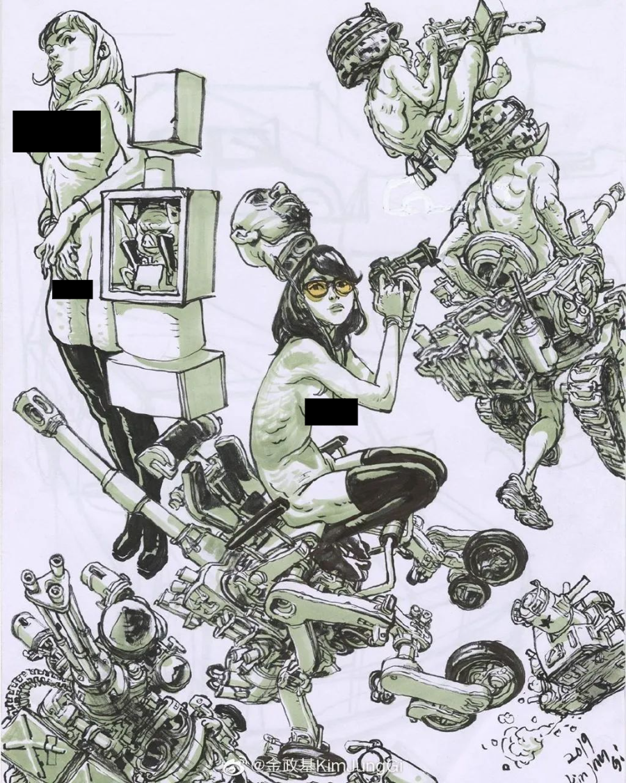 他寫實但又不止于寫實,金政基的作品,更多的是天馬行空的超現(xiàn)實主義,以及具有批判性質(zhì)的現(xiàn)實主義。因為有軍隊服役的經(jīng)歷,他尤其喜歡軍旅生活,表現(xiàn)豐富的人體,機械類以及動物題材,因此,他也受到了眾多動畫、游戲、電影等領(lǐng)域的熱捧。軍旅、惡獸與性,被認(rèn)為是最具有金政基味道的題材。