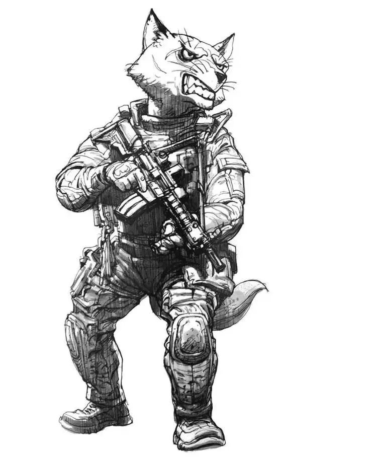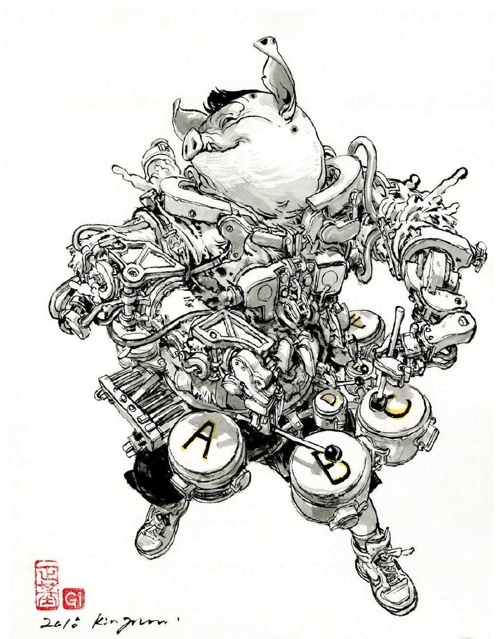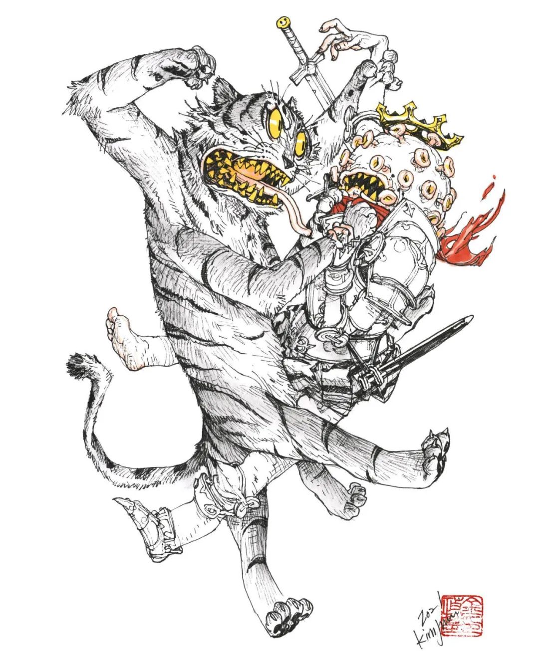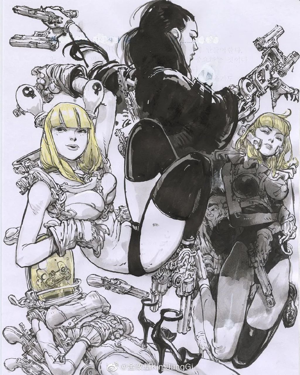 他寫實但又不止于寫實,金政基的作品,更多的是天馬行空的超現(xiàn)實主義,以及具有批判性質(zhì)的現(xiàn)實主義。因為有軍隊服役的經(jīng)歷,他尤其喜歡軍旅生活,表現(xiàn)豐富的人體,機械類以及動物題材,因此,他也受到了眾多動畫、游戲、電影等領(lǐng)域的熱捧。軍旅、惡獸與性,被認(rèn)為是最具有金政基味道的題材。