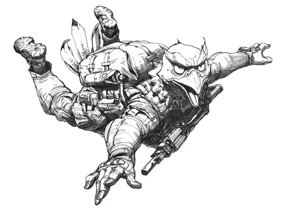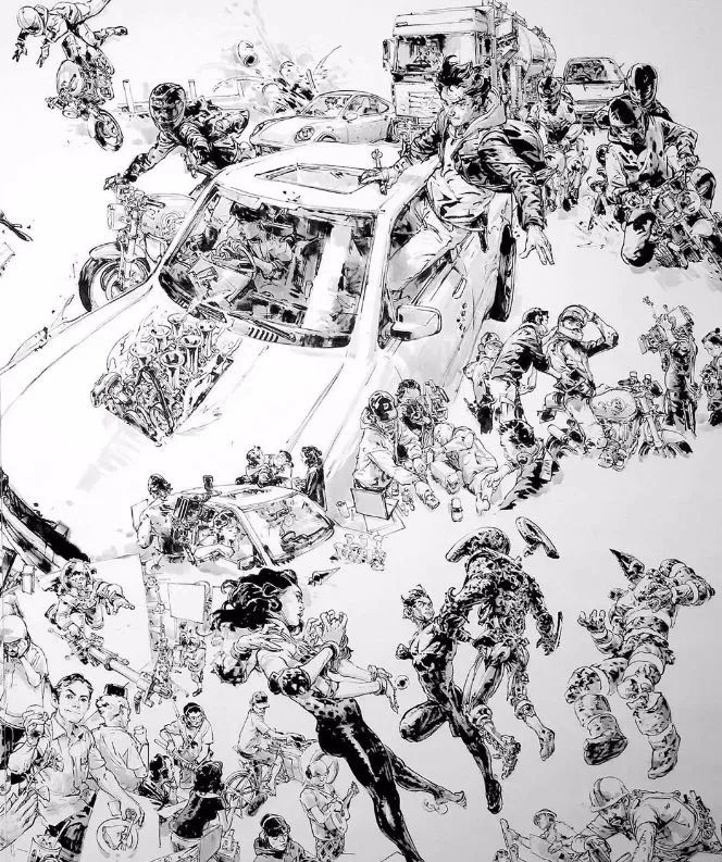 與此同時,金政基的科幻之中帶著細(xì)膩,畫每一個人物都仿佛在做人體解剖,線條流暢,造型準(zhǔn)確,非常寫實,仔細(xì)看,人體皮膚的紋路與褶皺都栩栩如生。