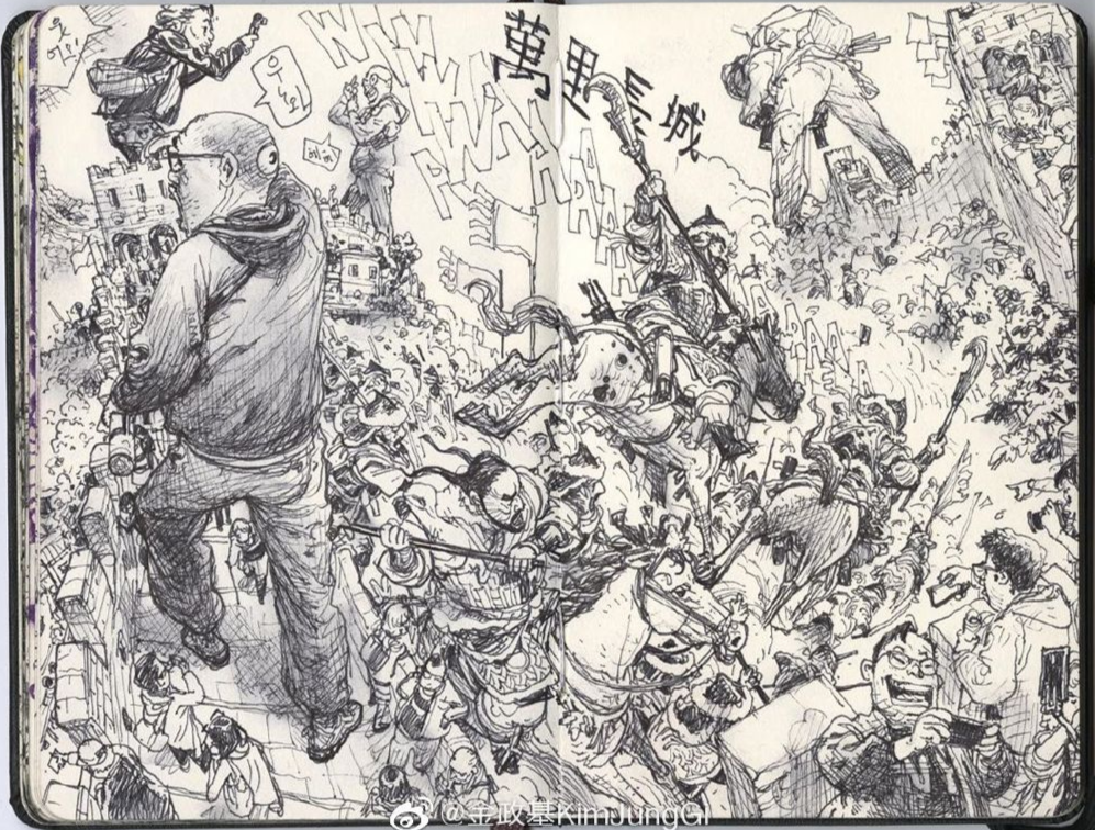 筆記本上隨手畫的萬里長城,兩個時代穿行,游覽的人與浴血奮戰(zhàn)的千軍萬馬同在。